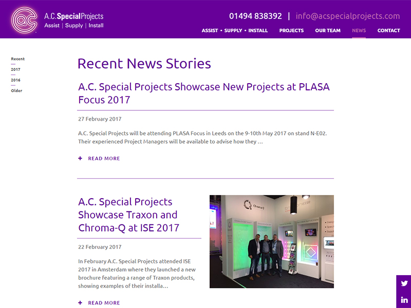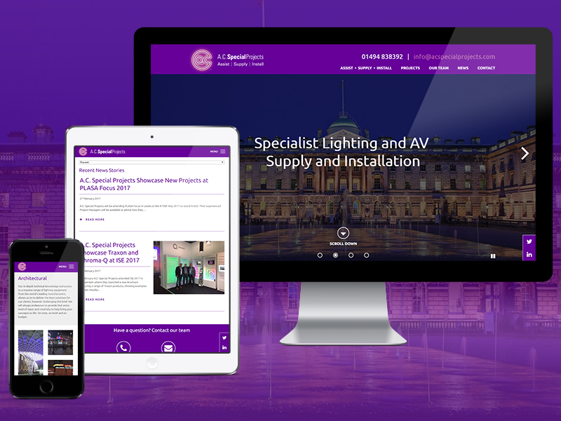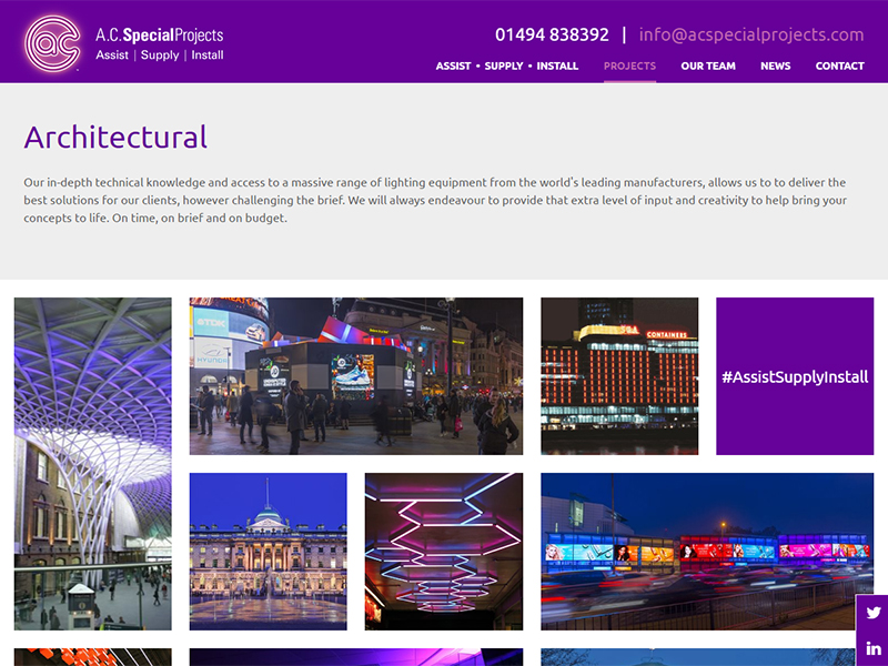 By teaming up on this project with The Line Agency, using their expertise of design and enhanced by our experienced technical team we were able to provide a striking gallery style website to match the company’s illuminating presence, with masonry images which smoothly transition in on scroll. The website was developed as a bespoke build for the customer using the latest Kentico CMS technology, which gives the customer total control of future text amendments, uploading of images and changing navigation as and when required. In addition A. C. Special Projects have chosen to host their site with us adding peace of mind with our secure servers and daily back up facilities.